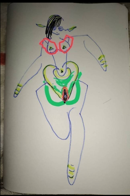 Attach "boobs" to the clenched "fist," and hang "arms" from it.
